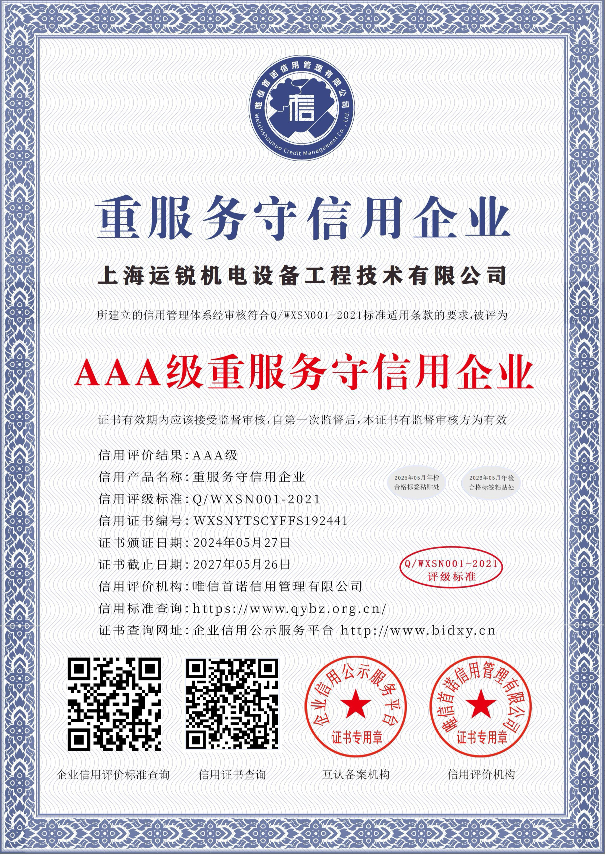 运锐获批上海住建委颁发的建筑业企业资质证书,成为行业内唯一同时具备建筑工程施工总承包资质、钢结构制作与安装专业承包资质,地基基础工程专业承包资质、建筑机电安装工程专业承包资质的设备生产厂家。并获得质量管理体系认证、环境管理体系认证、职业健康安全管理体系认证等三体系认证。
